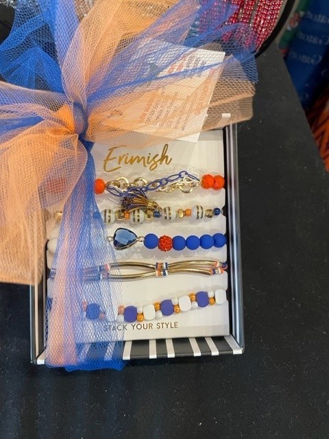5 stylish orange and blue stack bracelets in a bauble box! Enhance your 'arm party' & show your gator spirit!