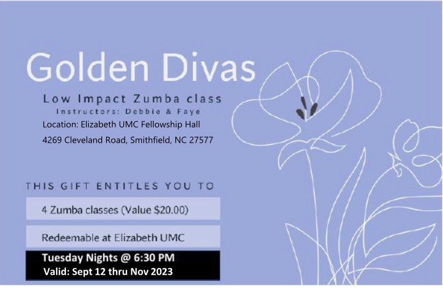 Dance Your Way to Fitness! A $20 Gift Certificate for Low-Impact and Beginner Zumba Classes. Get moving, have fun, and embrace a healthier lifestyle! Classes will be held every Tuesday at 6:30 PM starting on Tuesday, September 12, 2023 at 6:30 PM in Elizabeth United Methodist Church Fellowship Hall. Each class is 45 mins.