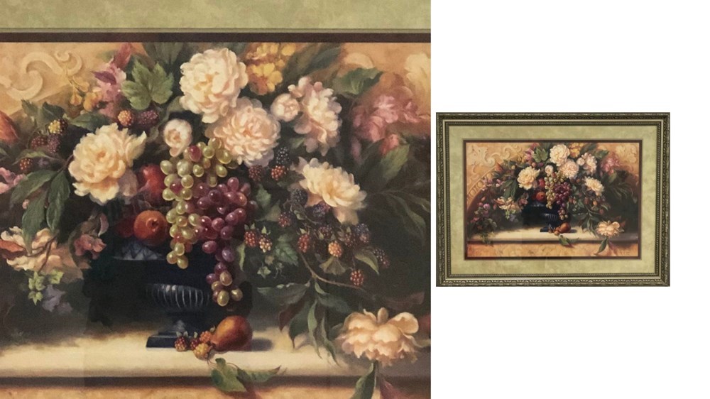 Flowers and Fruit Wall Art framed under glass is a captivating blend of nature's finest gifts captured in an exquisite work of art. The piece is encased in a tasteful frame, elevating its visual appeal and facilitating effortless display. This delightful fusion of natural beauty and artistic brilliance is not just a decorative piece, but a conversation starter that adds a touch of sophistication to any room. Here is your chance to own this one-of-a-kind artwork that embodies the grandeur of nature in its most captivating form. Dimensions: 40" W X 30" H Will be available for pickup at Elizabeth UMC
