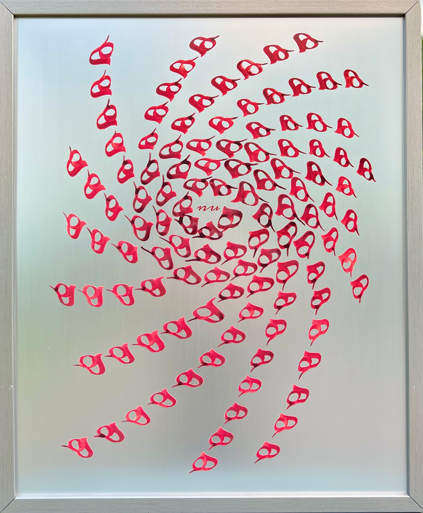 Persian Calligraphy - Ecstasy - spontaneous whirl 18x22 (inches) - Ink on Metal - silver substrate, red letters, champagne brushed wood frame