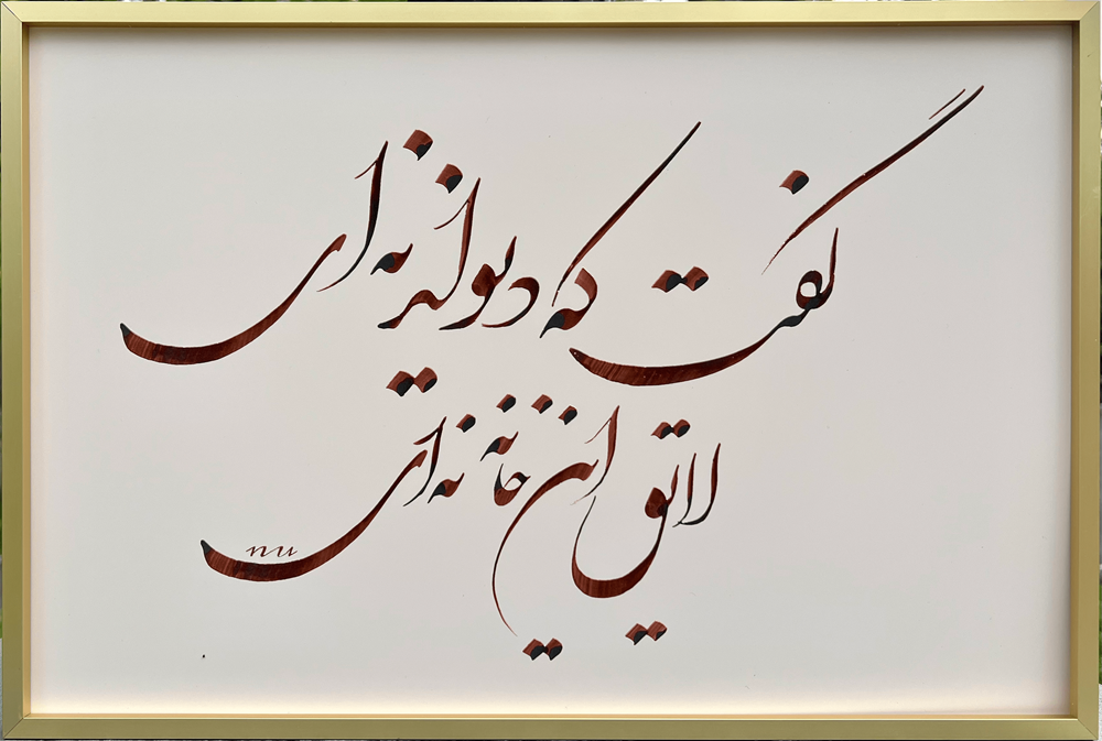 Persian Calligraphy - Rumi poem #1393 - Loving Insanity - you're not crazy enough, you don't deserve this home 18x12 (inches) - Ink on Metal - sand substrate with brown letters, gold metal frame