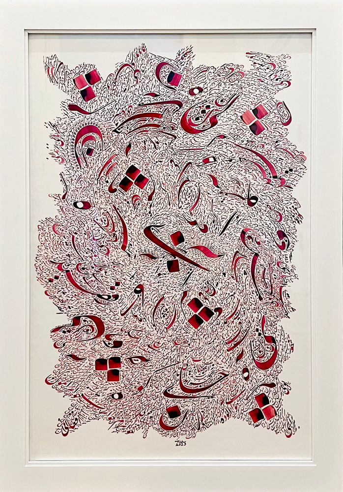 Persian Calligraphy - Grammy award winning song Baraye Azadi (For Freedom) 16x24 - Ink on Paper - white substrate with rose red letters, white wood frame